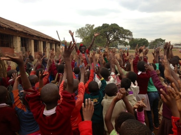 We have another funny memory that was a memory of me and Sibongile and a Clown from the United States, Selina. When we were doing a tour in Addis Ababa, we showed up at the school. Usually, one way … just to give context … when we do a show we come in, they’ve never seen, a lot of these places have never seen us perform or seen a theatre production or anything like that. We go in and we set up the audience. So, the first thing we do is we go and talk to the principal and say, hey, “How many kids are in your school? Great, we’re going to, if we can have a couple classrooms, come out one-by-one”, and then they’ll put their chairs in a certain area and we’ll create a, we’ll have the little kids and then the older kids and we make like a little theatre with different levels based on ages of children – and the last people are always standing up on desks looking over the thing. And so, we went into the school and we were like, “So how many people do you have?”, and he’s like, “We have 500”. So, I go, oh, “Okay! We can do that. Five hundred’s easy.” So, we’re like, there’s a HUGE courtyard so we’ll take the corner of the courtyard over here and then we’ll make a semi-circle and we’ll have the kids come out. We’ve planned it and we’ve found a classroom that was empty so we even started bringing out the benches to make a first row so that the kids can’t, if you don’t do that, we had this in our first, second year doing shows – we were doing shows in Soweto and we had to cancel them because the kids got closer and closer and closer until there was no space and then the teachers came out with belts and started hitting the kids back and we were like, “You can’t do that,” so we grabbed the belts and it was just a disaster. So, we learned from, Clowns learn from failure. We learn from our mistakes and we came up with a REALLY good method. So, this is now seven years later and we’re doing this tour in 2010 in Ethiopia and so we set it up, we’re all ready and then we always go back to the van because we want to make a little parade going in and, as we were doing this, the parade with the song, it was like a hit tune from the ’80s, that was about Zola Budd and it went (sings) … and we play this, I’ve got my banjo and Sibo was on the drums and Selina was on the violin. We’re tuning up and getting ready and then we look out the van and, our people from our Partner Organisations were organising this and it’s like the seventh day of the tour so we’re like they knew what to do but we looked out and there’s like, it looks like there are more than 500 people here. And so, I was like, okay, okay. I take my nose off and I run outside, okay, find the Principal. “What’s going on?” It’s like, I can’t find the Principal anywhere but we know that there’s like people from different schools because some are wearing a blue uniform and some are wearing an orange uniform, and some are purple. It turned out there were FIVE schools from the area came – and each school brought 500 kids. Suddenly we’re having to set up, like, okay guys, get out of the car, let’s go. We have to organise the audience to make it so that it’s safe. We had kids in classrooms that looked out onto the performance area. We put some kids up on the balcony areas. It took us an hour and a half to set up the kids. One person was doing fun things in the middle just to keep their attention. Finally, to get in, I remember Selina who was our leader, said, “How do I get in?” I was like, “You just GO!” I had my banjo and I’m swinging it like this to give us the space to go through. We make our way through to the front. Now we’re doing a show in the round and it was the most amazing show. We had a chair and our instruments and a little sound thing that was worthless because there were so many people. Everything was HUGE! […] You had to share it with like everybody so it’s like this amazing show. The kids were like, when you hear 2000, more than 2000 kids yelling and screaming and laughing, it’s amazing. Afterwards, we were like, “Did that just happen?” Because it was one of those epic performance stories.