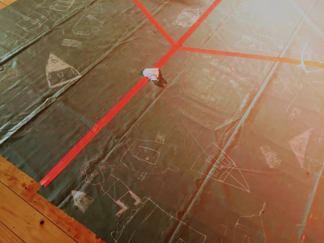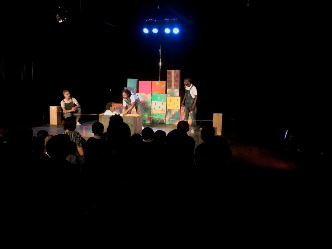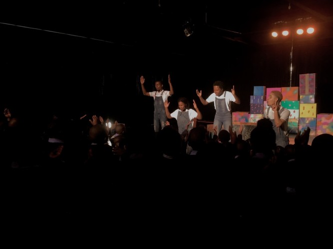 Ekhaya explores the relationship children have towards being at home and there was an opportunity for the young audience to contribute their responses to the Play – at the end, they were invited up to draw on the stage floor – many drawing pictures of houses and families.
