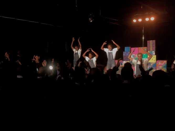 The synchronised and often comedic physicality induced much laughter and cheering. Whilst there was very little spoken text, music played a key role – a combination of beatboxing, clapping and singing. The songs were very catchy, with children following along with the words and/or hand actions – so much so that at times the Performance evolved into call and response mode.