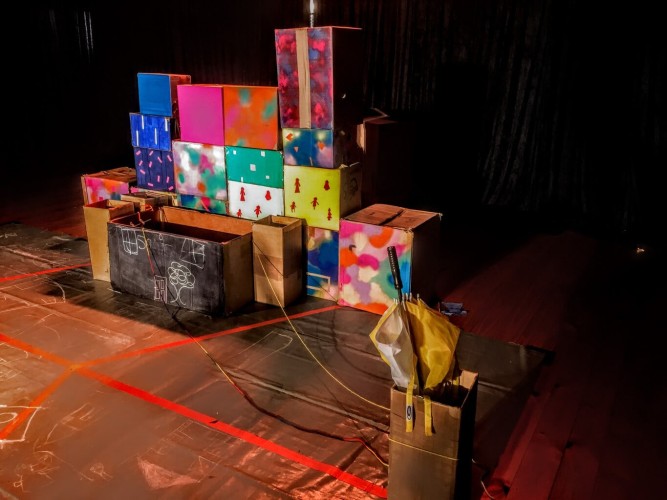 Nassimbeni’s design saw the show open with a very simple set of cardboard boxes. The plain white and denim costumes gave away no clues as to what was about to unfold. The children started watching the performance somewhat confused. However, with the cast removing the plain cardboard facade, colourful painted boxes and blankets were revealed which received an audible gasp of “Wooooooooow” from the audience. “It’s amazing”, one of the children said out loud, whilst their friends clapped in amazement and others stood up to get a closer look at the set transformed from monochrome to rainbow.